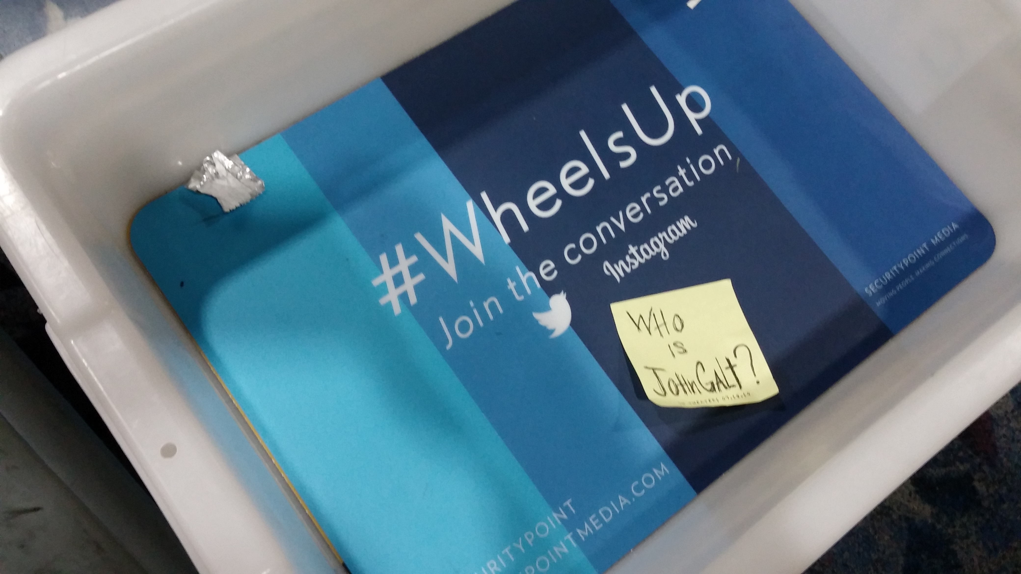 While the placement isn't as good as Scott's, I was able to put a Who Is John Galt postit in the bottom of the tray at TSA. After all...they did force me to take them out of my pocket.