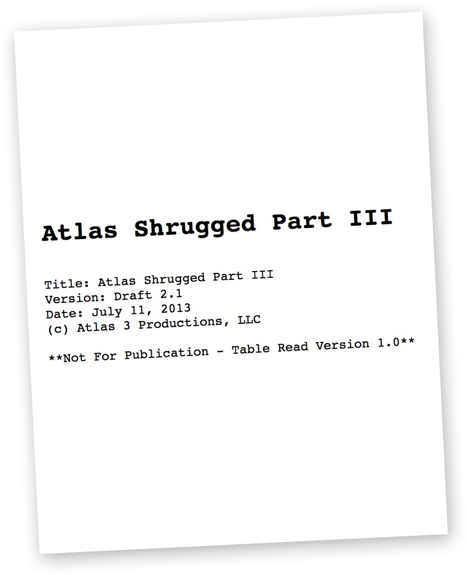 Gulch Producers, we are proud to present to you three (unfinished) pages from the Atlas Shrugged Part 3 script...