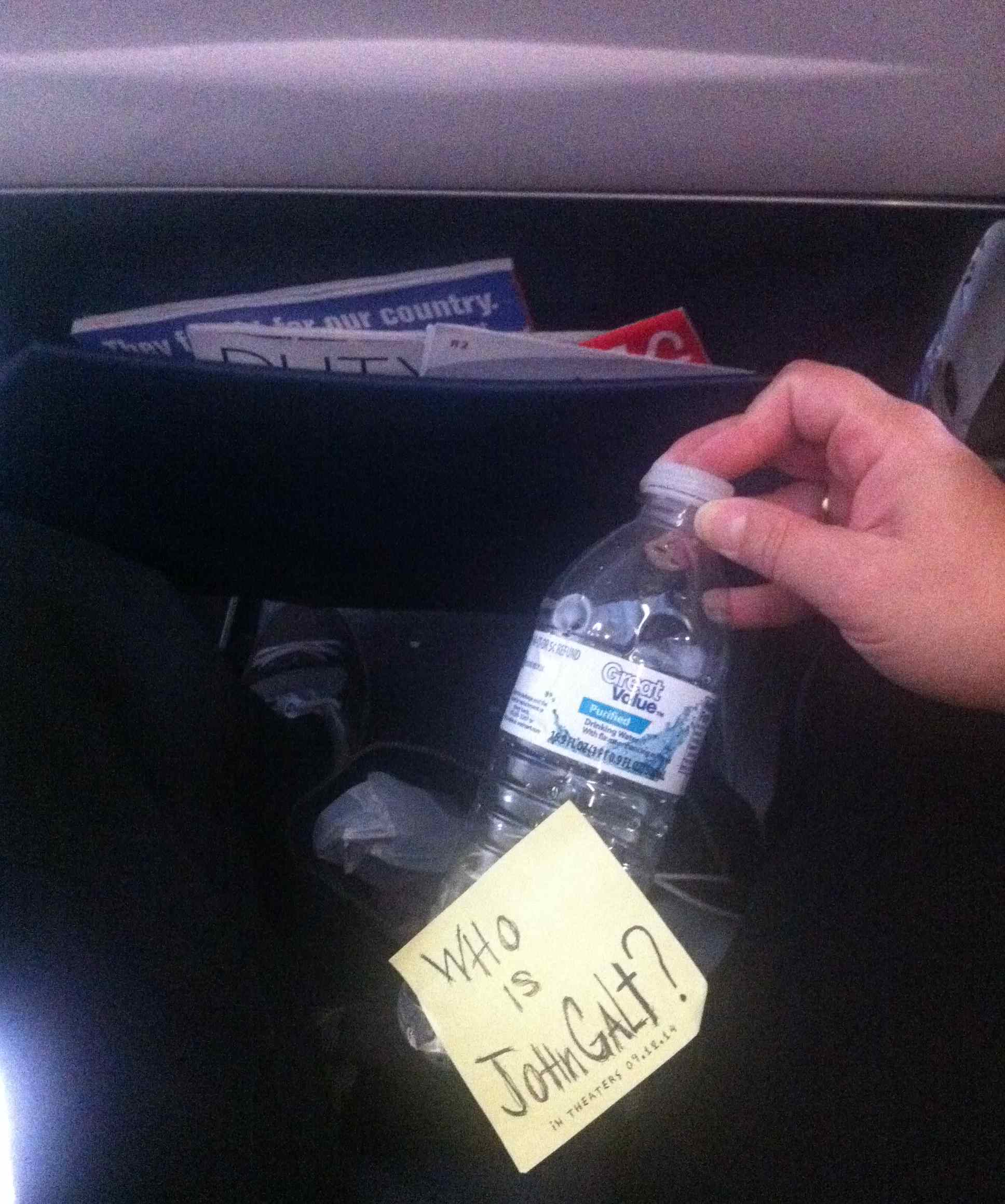 On a plane, with magazines referencing the military, a few air sick bags? and a bottle of WalMart water. I think the postit is very appropriate since you obviously got a bottle of WalMart water through TSA, aka Thousands Standing Around. Of course unless there is now a WalMart in an airline terminal?