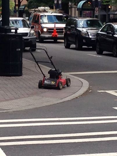 Lawnmower Person Shrugs in Downtown Charlotte